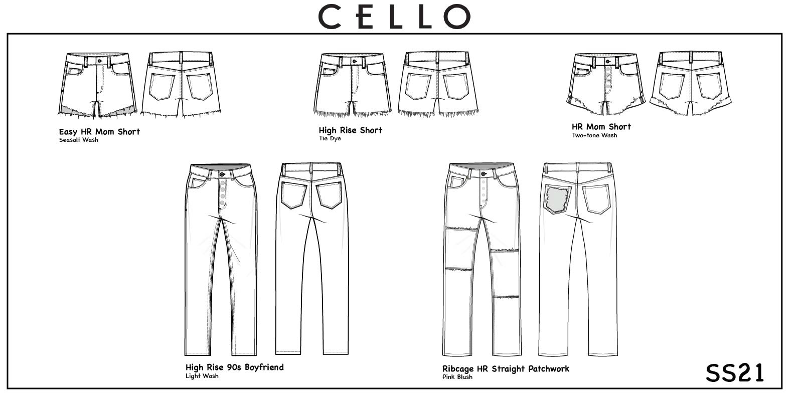 Cello Jeans focuses on commercially relevant women’s denim at a contemporary price point. The work emphasized silhouette clarity, wash variation that supports seasonal sell-through, and fit consistency across the line. Direction prioritized strong core products while integrating targeted updates to respond to buyer and trend cues within a commercial calendar.